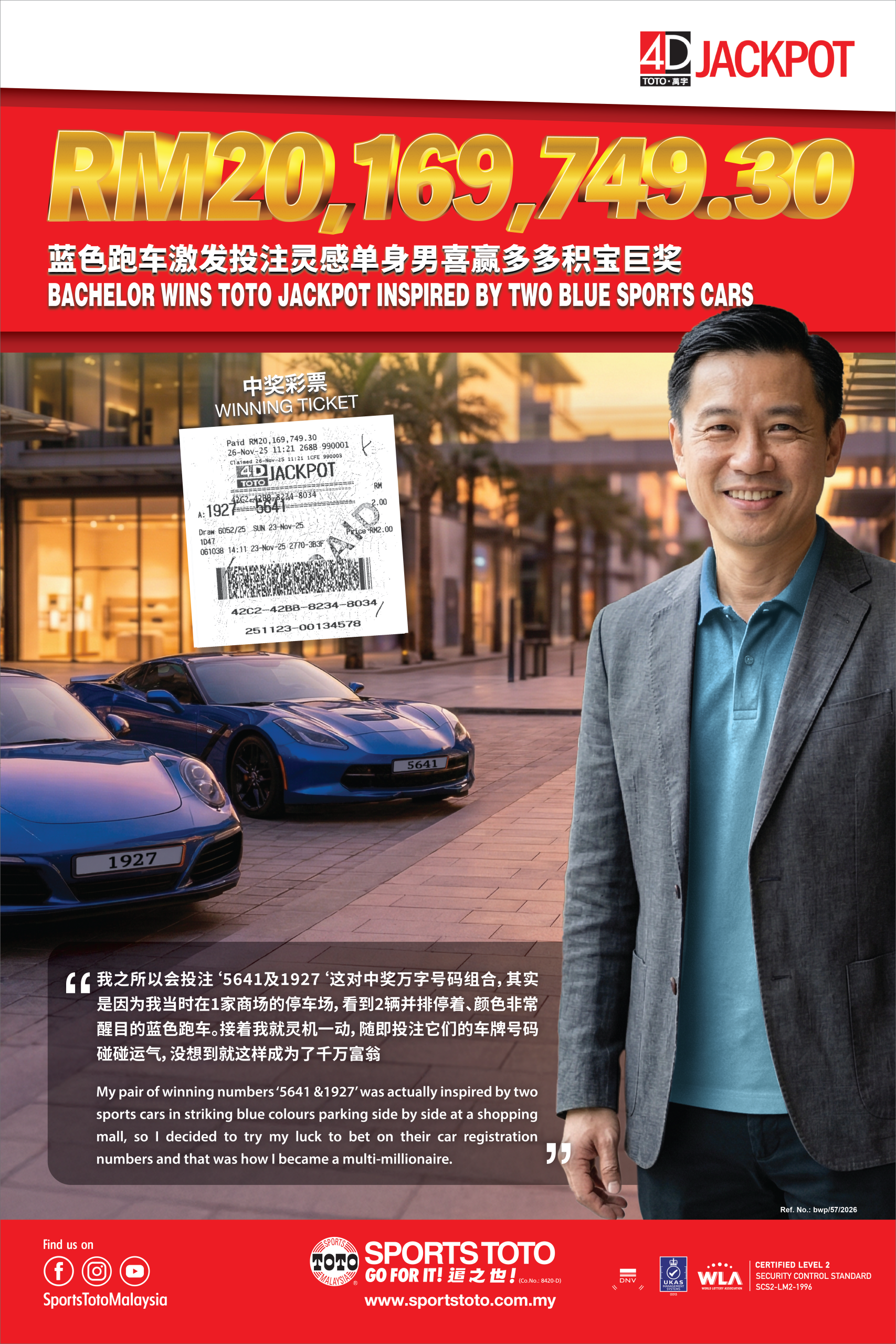 My pair of winning numbers ‘5641 &1927’ was actually inspired by two sports cars in striking blue colours parking side by side at a shopping mall, so l decided to try my luck to bet on their car registration numbers and that was how I became a multi-millionaire.