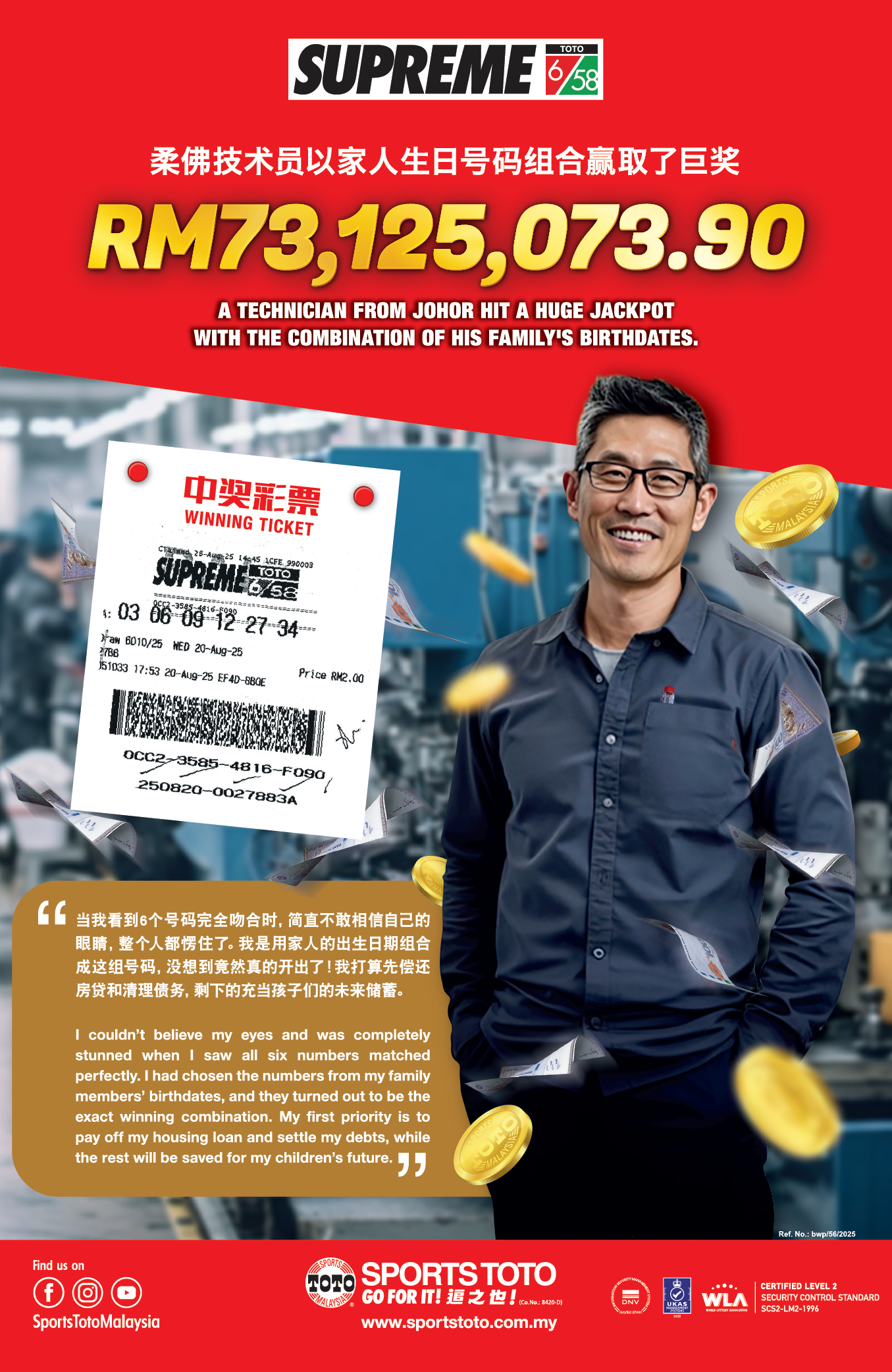 柔佛技术员以家人生日号码组合赢取了巨奖。RM73,125,073.90
