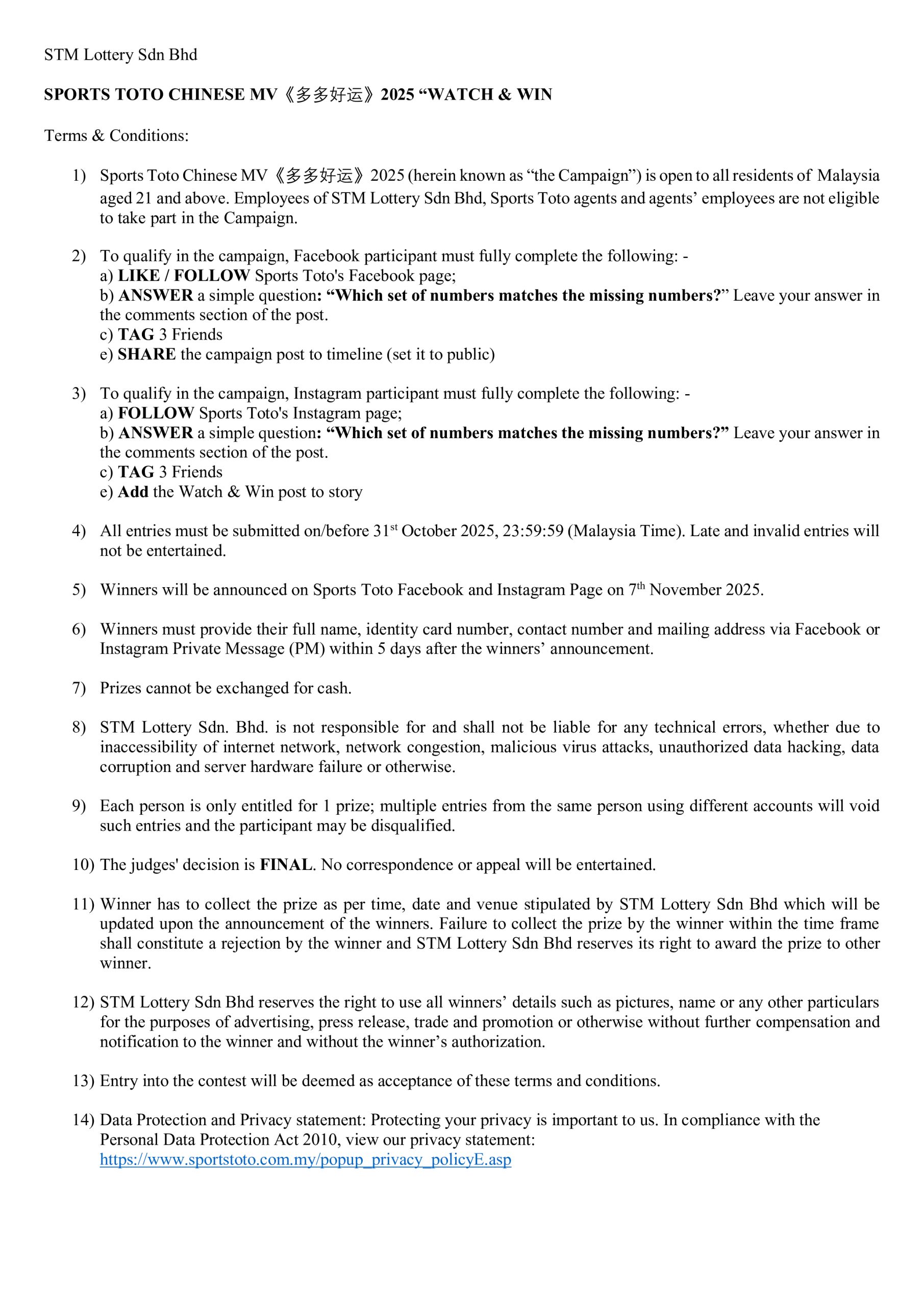 SPORTS TOTO CHINESE MV《多多好运》2025 WATCH & WIN